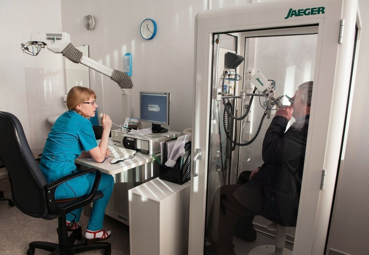 Диагностика нарушений функции внешнего дыхания проводится на оборудовании фирмы «Erich Jaeger» (Germany). Оно позволяет полностью оценить функцию внешнего дыхания, начиная с традиционных измерений дыхательных объемов, проходимости дыхательных путей и, заканчивая более сложными исследованиями: диагностика скрытых полостей и механики дыхания с исследованием механики дыхания. Преемственность диагностического процесса дает возможность полной объективной оценки проходимости дыхательных путей и структуры легочных объемов. Особую значимость исследования приобретают в экспертной оценке трудных клинических случаев, при редко встречающейся патологии. Оборудование фирмы «Erich Jaeger» является эталоном в мировой клинической практике для исследования функциональных возможностей аппарата внешнего дыхания. Все диагностические системы работают по стандартам, предъявляемым для такого рода исследований. Компьютерный комплекс «MasterLab Body Pro», позволяет оценивать структурную перестройку легочных объемов, недоступную при стандартной спирографии, определять механические свойства дыхания. На спироанализаторе «Master Screen IOS» проводятся исследования сопротивления дыхательных путей без воспроизведения дыхательных маневров детям и ослабленным больным.