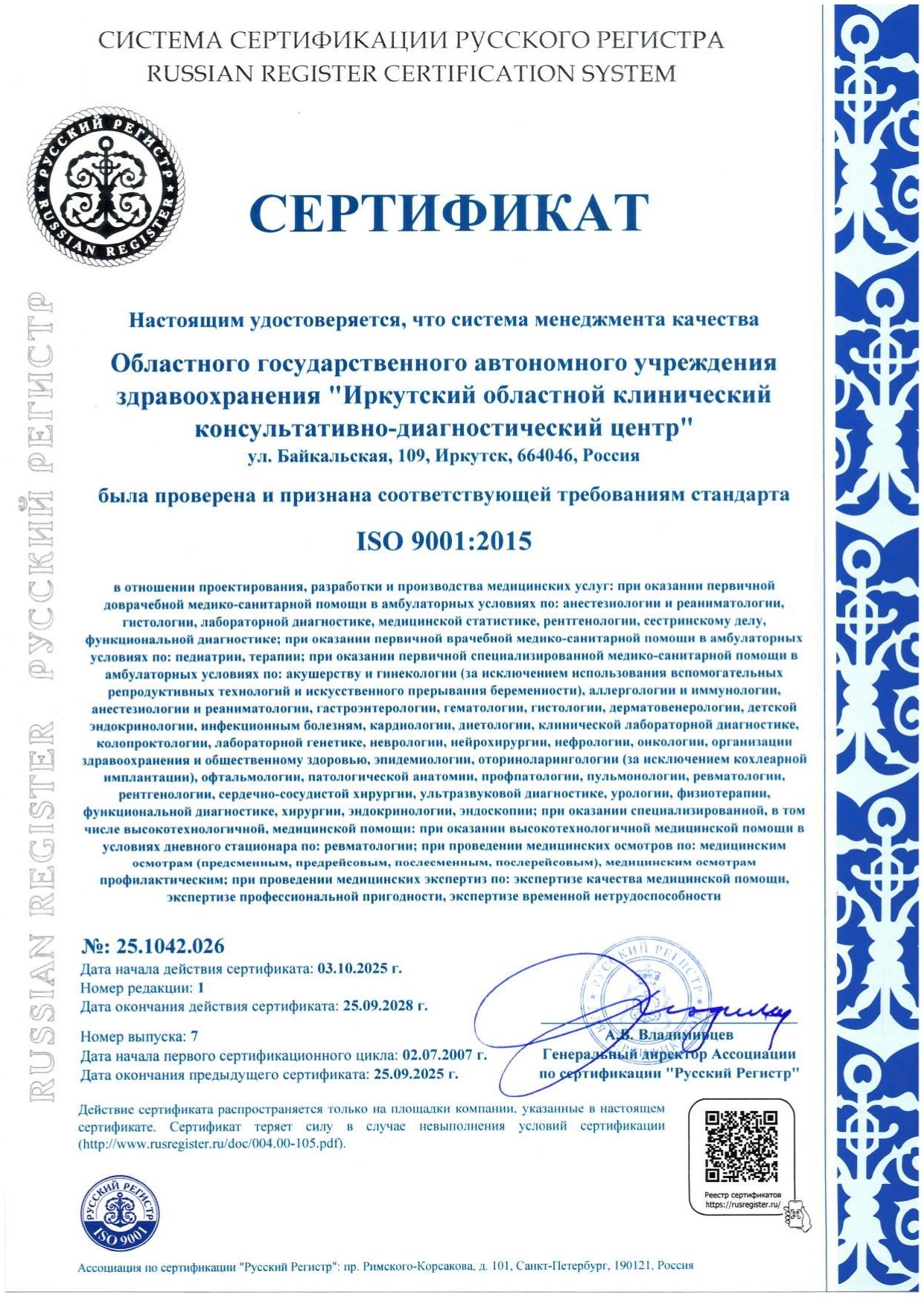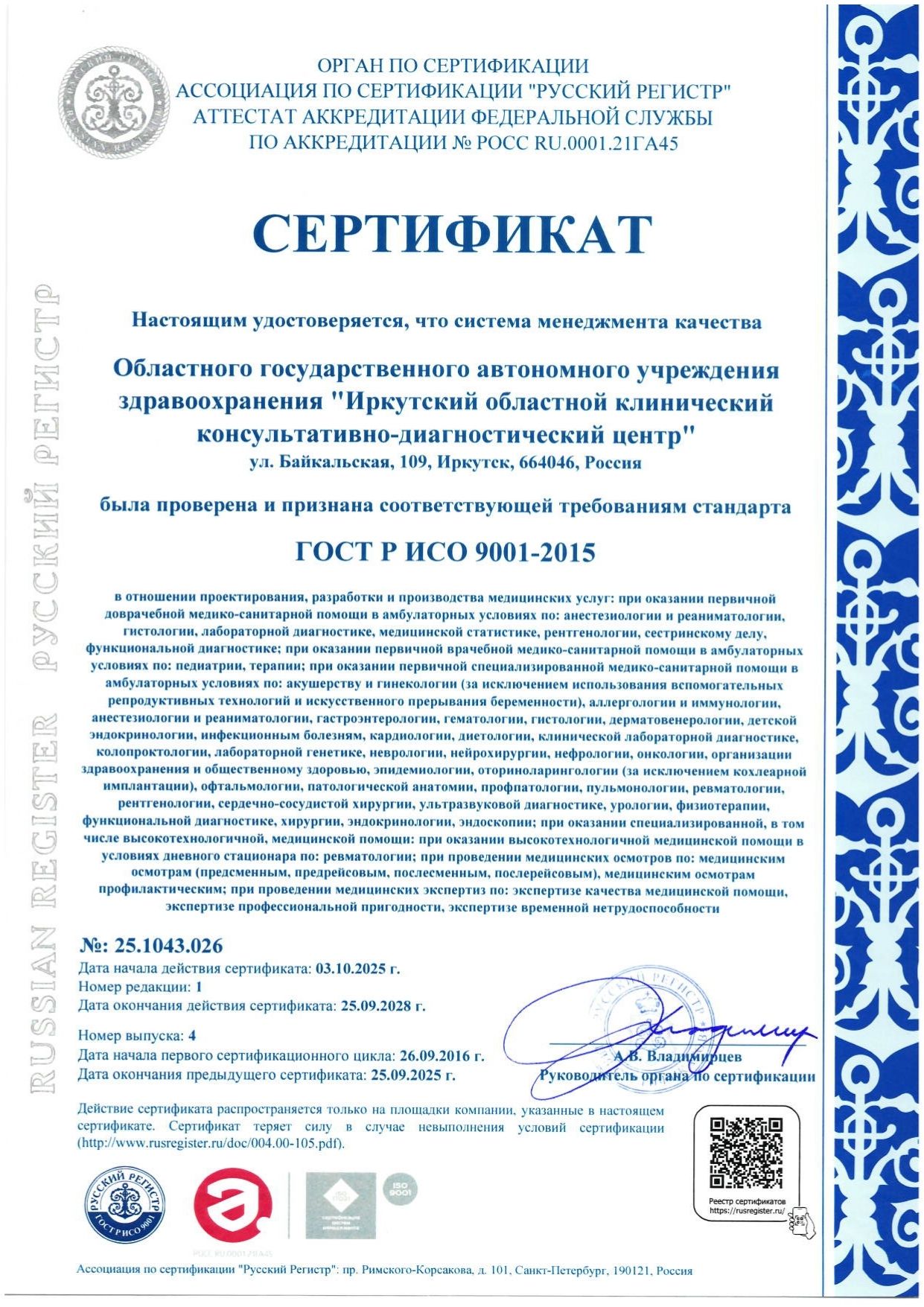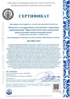 В Иркутском областном клиническом консультативно-диагностическом центре разработана, документально оформлена, внедрена, поддерживается в рабочем состоянии и постоянно улучшается система менеджмента качества (СМК), соответствующая требованиям международных стандартов ISO серии 9001.
