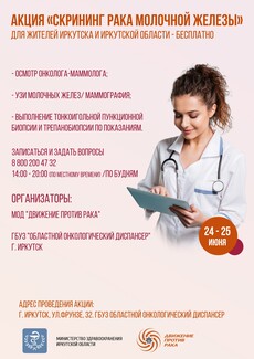 24 и 25 июня пройдет специальная акция для жителей Иркутска и Иркутской области. В рамках которой бесплатно можно будет пройти осмотр онколога-маммолога, в случае необходимости выполнить дополнительные исследования.