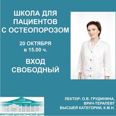 В рамках этого дня 20 октября в 15.00 приглашаем всех желающих на открытую лекцию для пациентов "Актуальные вопросы остеопороза". Кандидат медицинских наук, врач Центра профилактики остеопороза ИДЦ Оксана Викторовна Грудинина расскажет о признаках заболевания, лечении, профилактике.