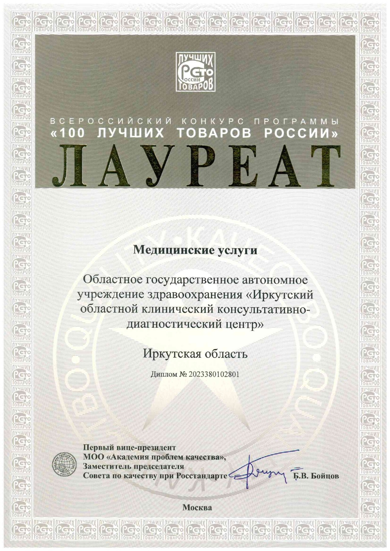 Иркутский диагностический центр в шестой раз (!) стал победителем Всероссийского конкурса «100 лучших товаров России» в номинации «Медицинские услуги». Награды предприятиям-победителям сегодня в торжественной обстановке вручил Губернатор Иркутской области Игорь Кобзев.