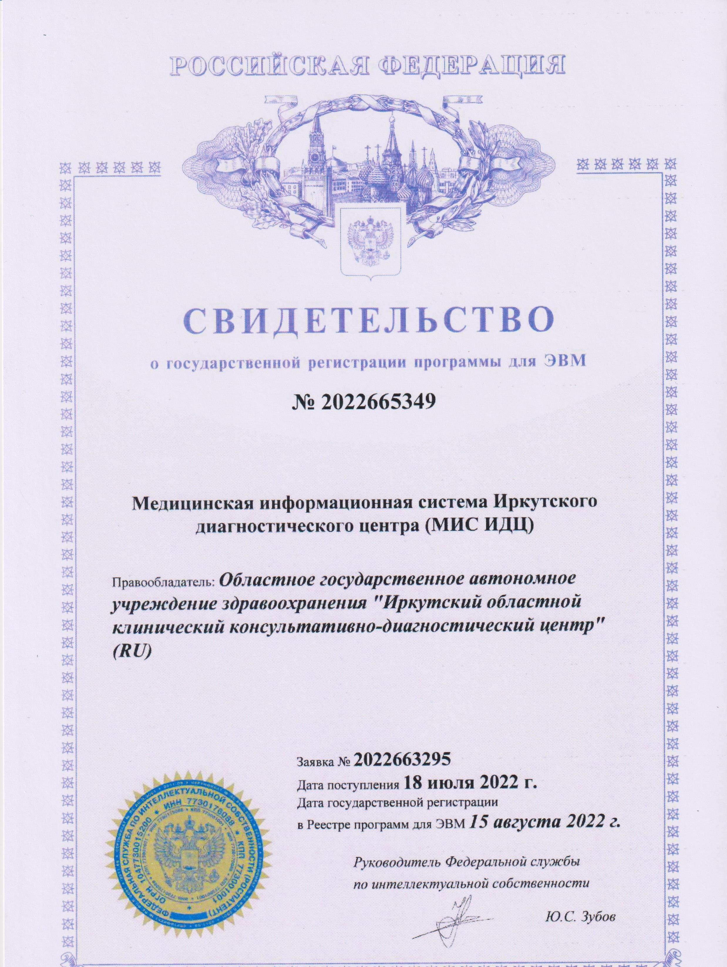 Медицинская информационная система Иркутского диагностического центра («МИС ИДЦ»), свидетельство о государственной регистрации программ для ЭВМ №2022665349 - комплексная автоматизированная информационная система, в которой объединены электронные медицинские записи о пациентах, данные медицинских исследований в цифровой форме, данные мониторинга состояния пациента с медицинских приборов, средства общения между сотрудниками, финансовая и административная информация. Работа МИС осуществляется в отечественной операционной системе на базе LINUX, данные локального сегмента размещены на серверах организации (простой системы не более 10 минут/месяц).